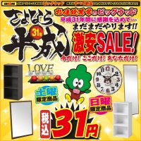 3月21日(木)~26日(火)は、さよなら平成31年 激安SALE!3月21日(木)から24日(日)まで日替わり超目玉商品が目白押し!平成31年に感謝を込めて31円の商品をご用意しました!もちろん、ほかにもお買い得品が盛りだくさんご用意しておりますので、ぜひ今週のチラシをご覧くださいませ。