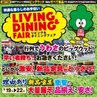 5/19(土)~22(火)は快適な暮らしのお手伝い「リビング&ダイニングフェア」行列でうわさのビッグウッド!とにかく激安!ベッドもソファーも食卓セット、食器棚、テレビボード、タンスも…新品家具がどっさり!早い者勝ち!お急ぎください!!