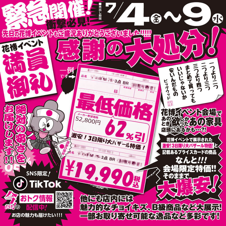 7月4日(金)~9日(水)の6日間限定で鶴見緑地イベント感謝の大処分セール開催します!